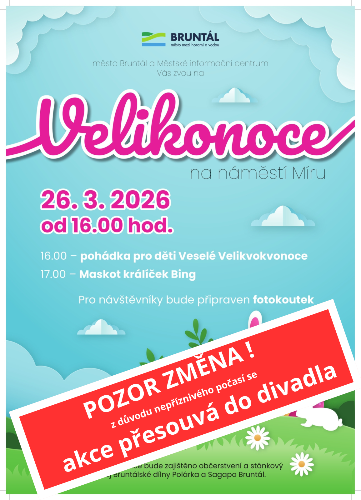 Velikonoce. (Divadlo) 26.03.2026 od 16:00 do 18:00 hod. Městské divadlo Bruntál, Bruntál | Mapa Velikonoce na náměstí v Bruntále se z důvodu nepřízně počasí přesouvá do Městského divadla Bruntál. | |