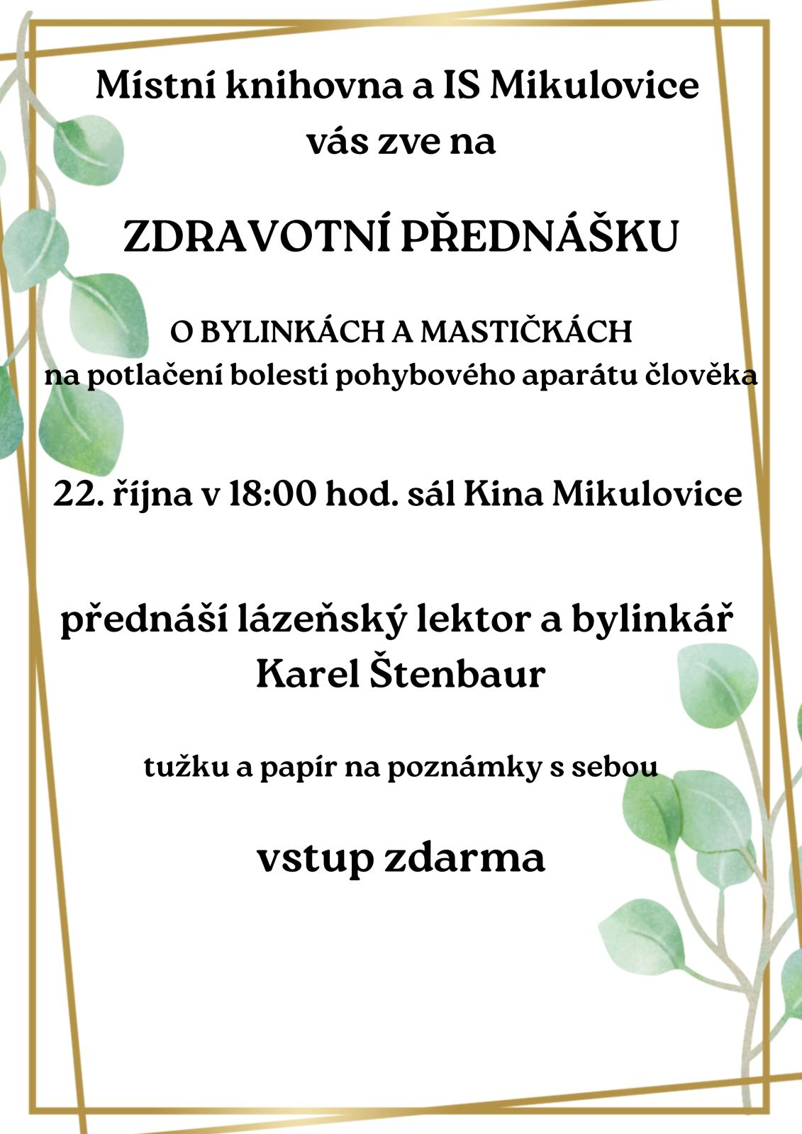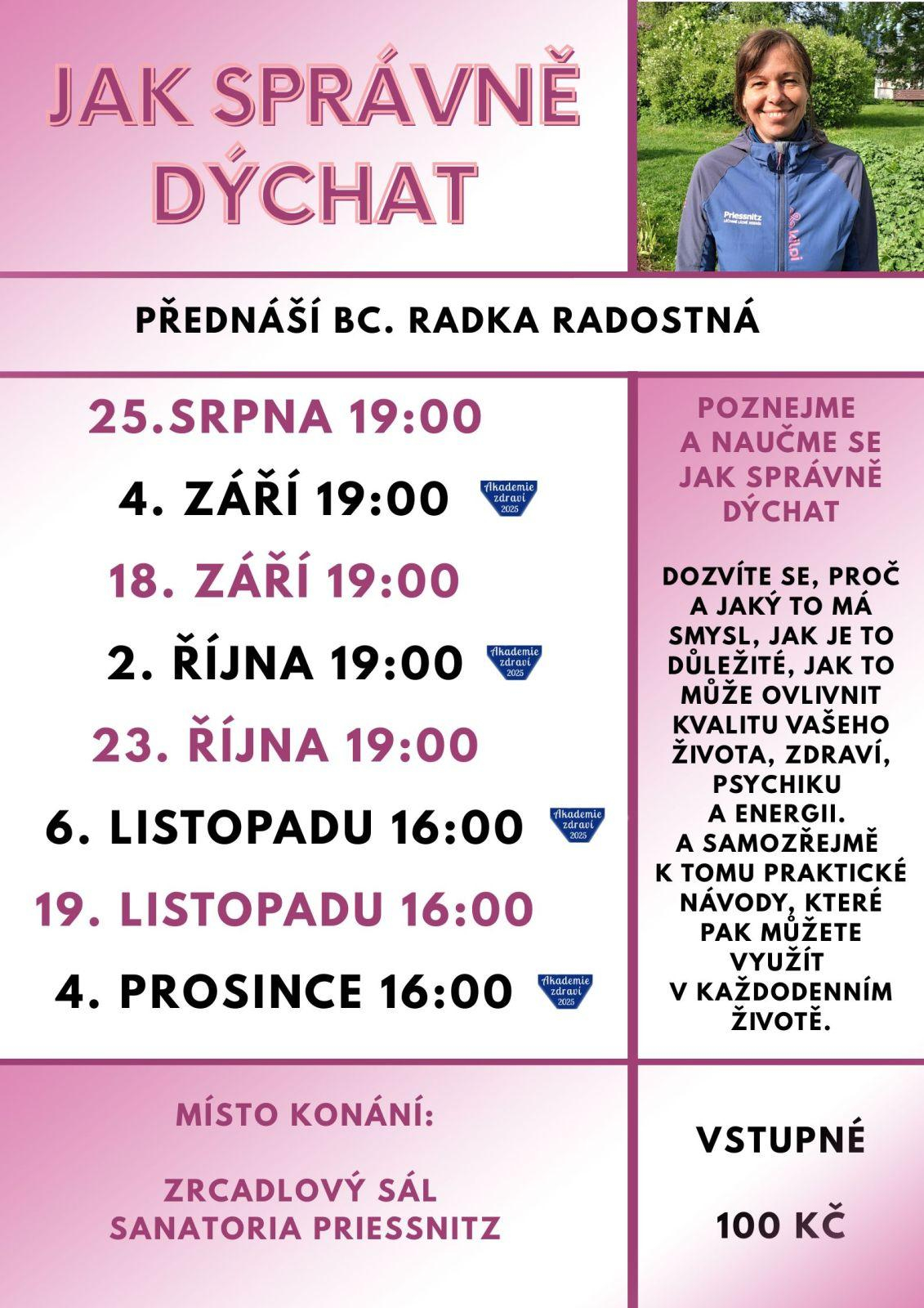 O našem dechu a jeho významu pro zdraví fyzické i psychické, koná se v rámci Akademie zdraví, přednáší klimatoterapeutka Radka Radostná. Vstupné 100 Kč.