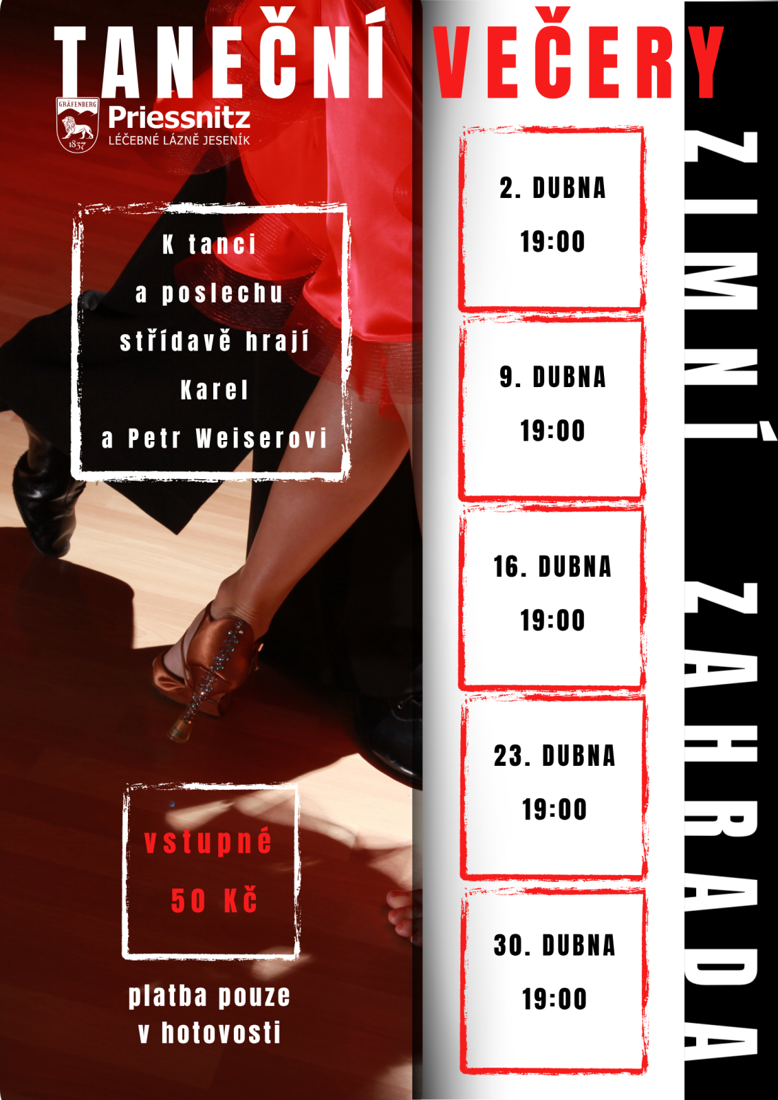 Adresa: Priessnitzova 913 / 26 79001 Jeseník Jeseník, Olomoucký kraj Česko Poslední změna: 27.03.2026 | čtvrtek16.dubna TANEČNÍ VEČER - Taneční akce 16.04.2026 od 19:00 do 22:00 hod. Priessnitzovy léčebné lázně a.s., Zimní zahrada, Jeseník | Mapa K tanci a poslechu střídavě hrají Karel a Petr Weiserovi. Občerstvení zajišťuje sehraný kolektiv lázní. Vstupné 50 Kč. Pořádají PLL a.s. |