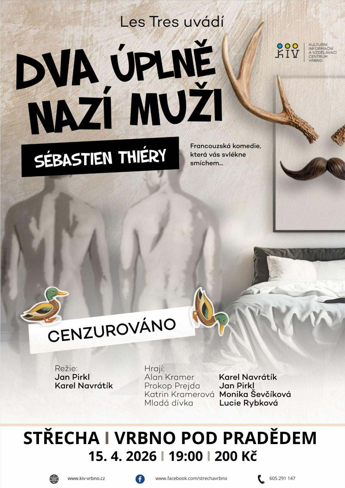 Dva úplně nazí muži (Divadlo) 15.04.2026 od 19:00 do 21:00 hod. STŘECHA, Vrbno pod Pradědem | Mapa Francouzská divadelní komedie | |