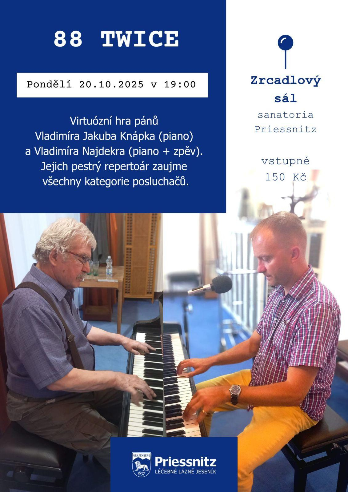 DUO 88TWICE (Koncerty) 20.10.2025 od 19:00 do 20:30 hod. Priessnitzovy léčebné lázně a.s., Zrcadlový sál, Jeseník | Mapa Dva pánové, dva klavíry a svěží repertoár nejenom z jazzového šuplíku. Vstupné 150 Kč. | |