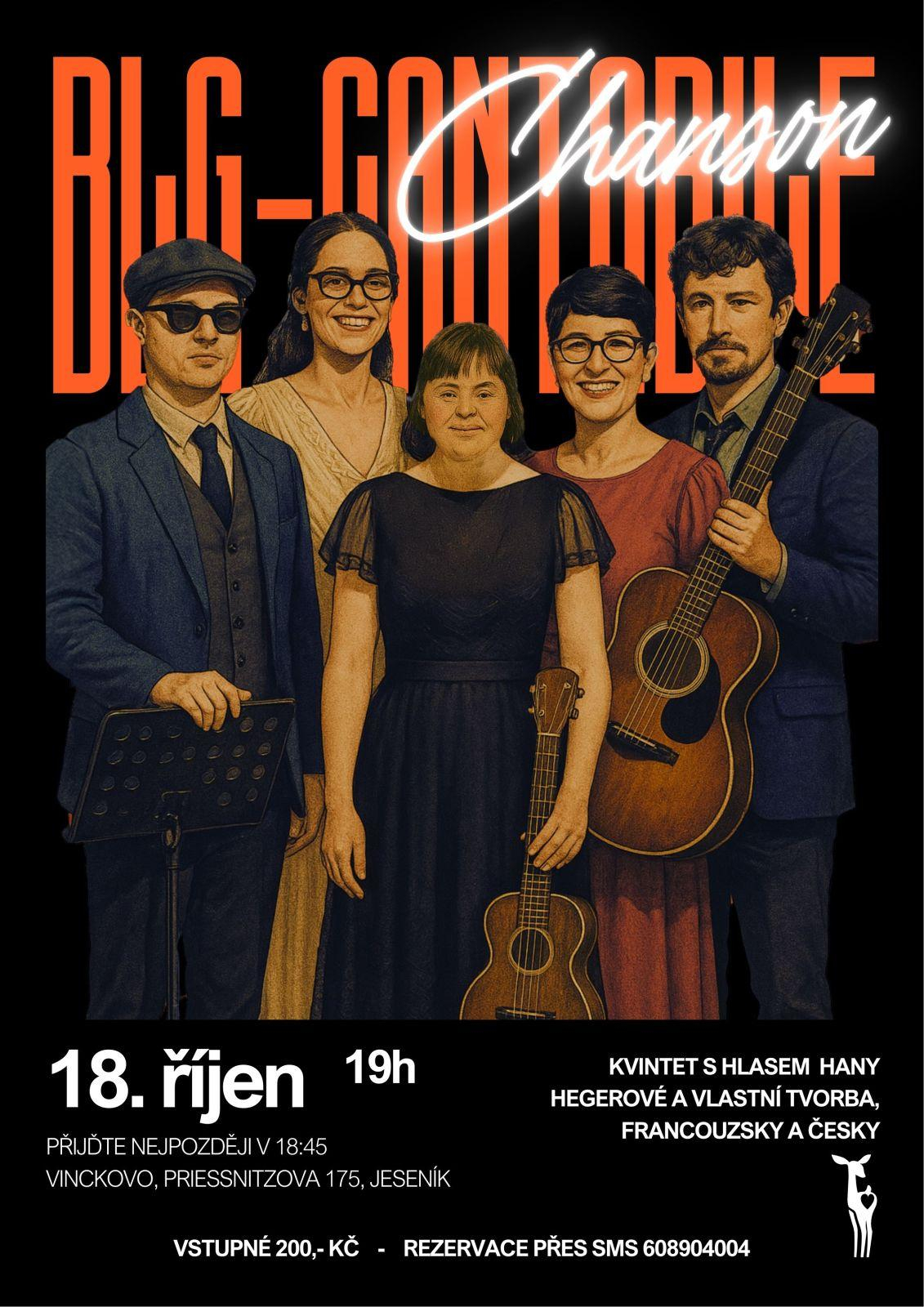 BLG-CANTABILE ŠANSON (Koncerty) 18.10.2025 od 19:00 do 21:00 hod. Vinckovo kafe, Jeseník | Mapa Večer plný swingu, šansonu a autorské tvorby! V repertoáru najdete známé písně v originální úpravě, některé s přebásněnými českými texty, i původní tvorbu zpěvačky Anny Bínové a muzikantky Kataríny Grochal. Vstupné 200 Kč. | |