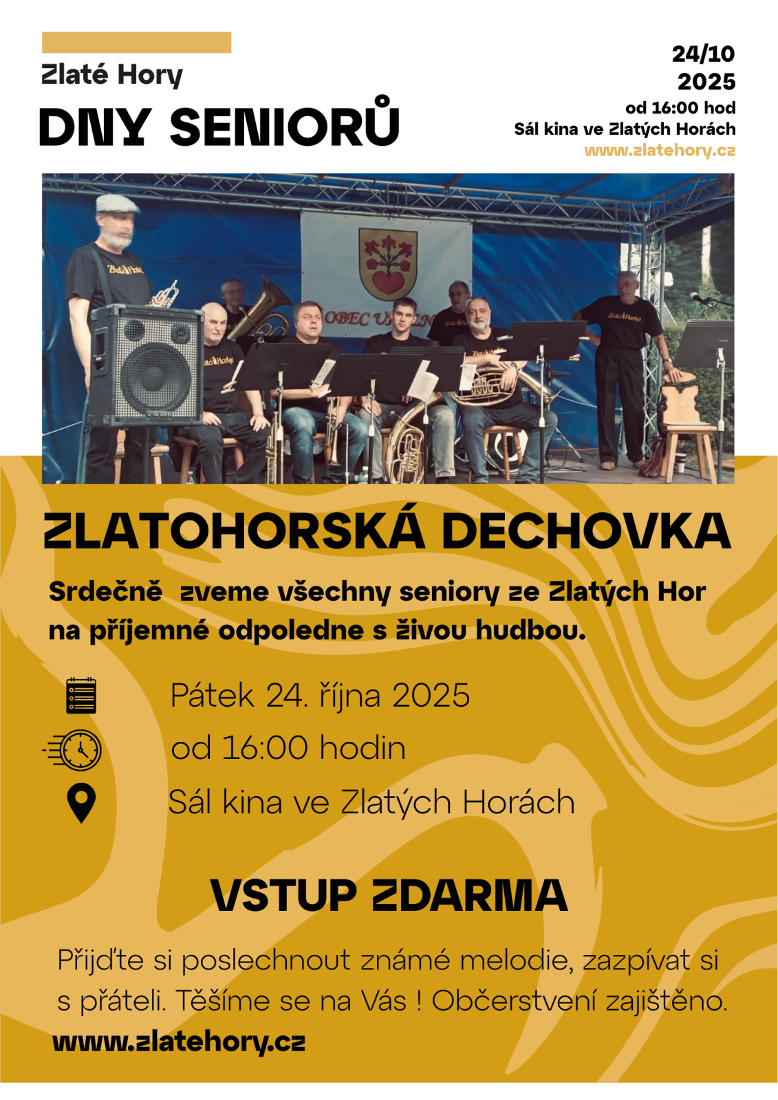 DNY SENIORŮ 2025 - ZLATOHORSKÁ DECHOVKA (Koncerty) 24.10.2025 od 16:00 do 19:00 hod. kino Zlaté Hory, Zlaté Hory | Mapa Srdečně zveme všechny seniory ze Zlatých Hor na příjemné odpoledne s živou hudbou. | |