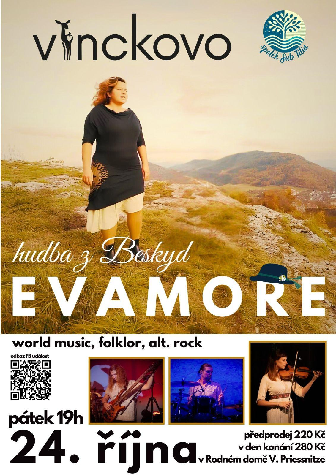 Evamore (Koncerty) 24.10.2025 od 19:00 do 21:00 hod. Vinckovo kafe, Jeseník | Mapa Evamore je pětičlenná hudební skupina z Beskyd, která hraje písně o lásce a beskydské krajině. Vstupné v předprodeji 220 Kč (v kavárně nebo přes qr kód, napište si). V pátek na místě 280 Kč. | |