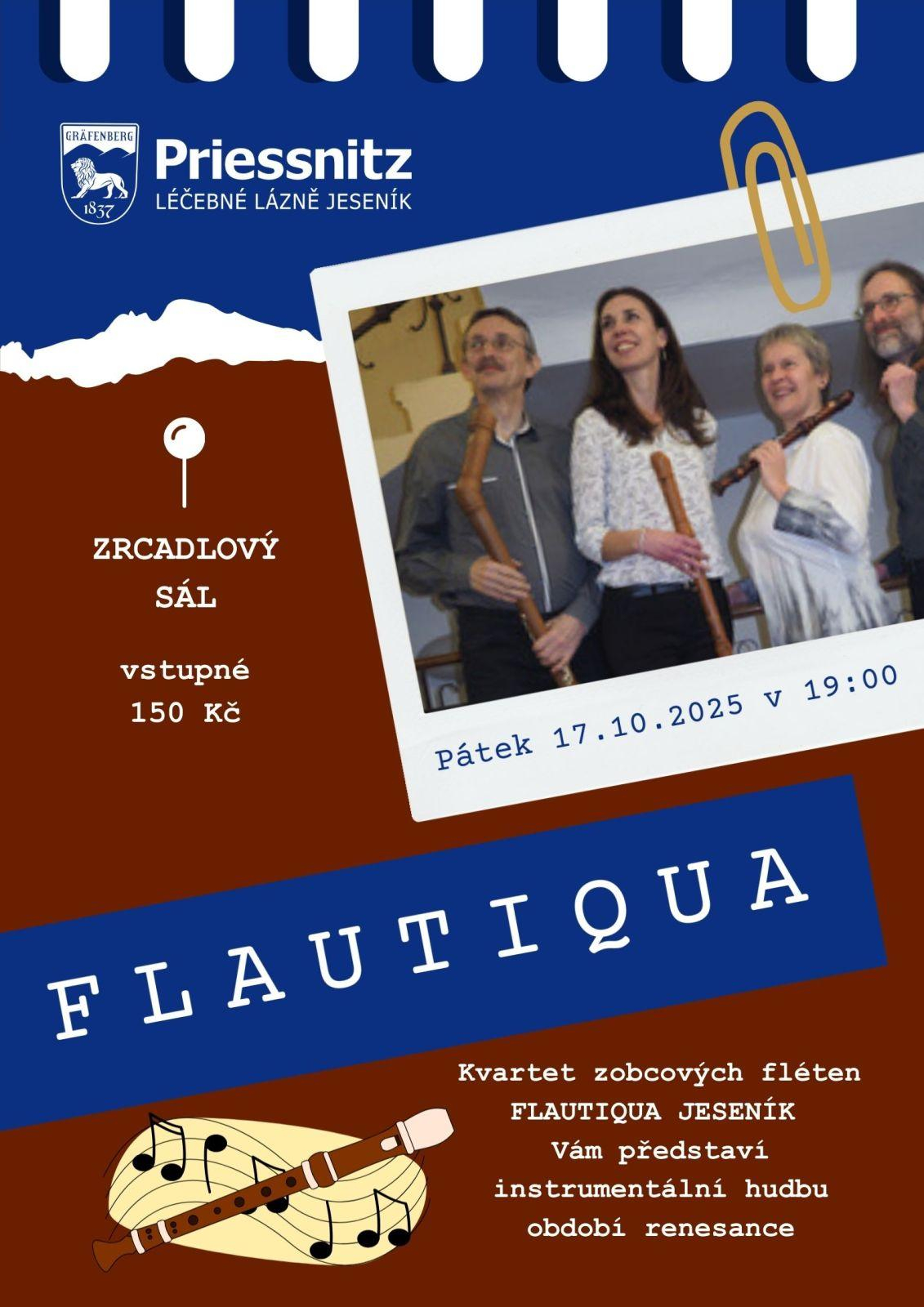 KONCERT FLAUTIQUA (Koncerty) 17.10.2025 od 19:00 do 20:00 hod. Priessnitzovy léčebné lázně a.s., Zrcadlový sál, Jeseník | Mapa Přijměte pozvání do období renesance (cca 1430–1600), které se vyznačovalo obnoveným zájmem o antiku, důrazem na harmonii, « libozvučnost » a « řád », a rozvojem polyfonie, kdy se do popředí dostala vokální hudba (mše, madrigal, chanson) a rozvíjela se i instrumentální hudba. Kvartet zobcových fléten Flautiqua Jeseník vám představí instrumentální hudbu tohoto období. Vstupné 150 Kč | |