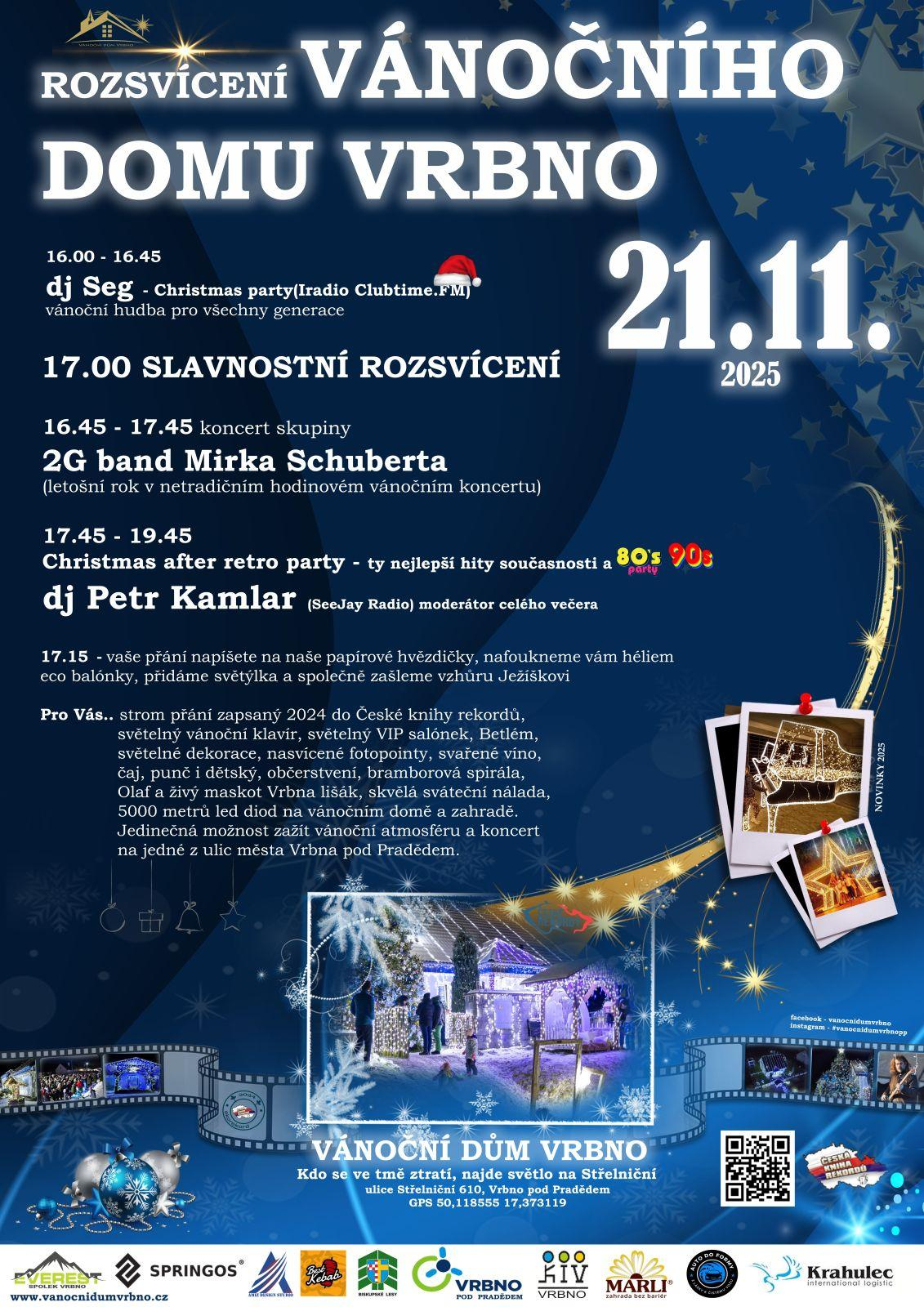 Rozsvícení Vánočního domu Vrbno (Ostatní) 21.11.2025 od 16:00 do 18:00 hod. Vánoční dům, Vrbno pod Pradědem Rozsvícení vánočního domu ve Vrbně se letos uskuteční 21. listopadu 2025. Nebude chybět živá hudba! | |