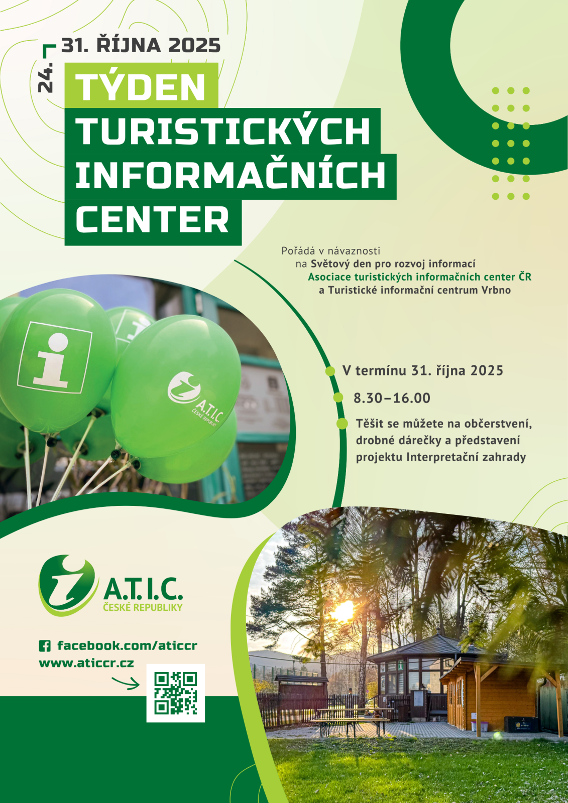Den TIC Vrbno (Ostatní) 31.10.2025 od 08:30 do 16:00 hod. Turistické informační centrum Vrbno, Vrbno pod Pradědem V pátek 31. října 2025 v infocentru ve Vrbně pod Pradědem oslavíme tradiční Týden turistických informačních center. Těšit se můžete na občerstvení a drobné dárky! | |