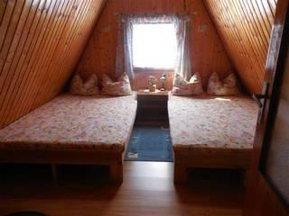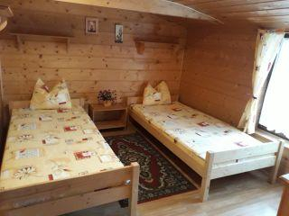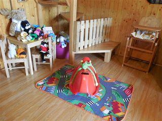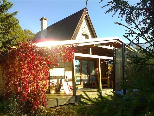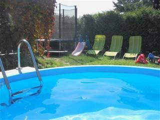 Na prosluněném místě opolocené zahrady u chaty je k dispozici plastový bazén, dětské prolézačky, skluzavky, pískoviště a zahradní posezení s venkovním krbem a udírnou.